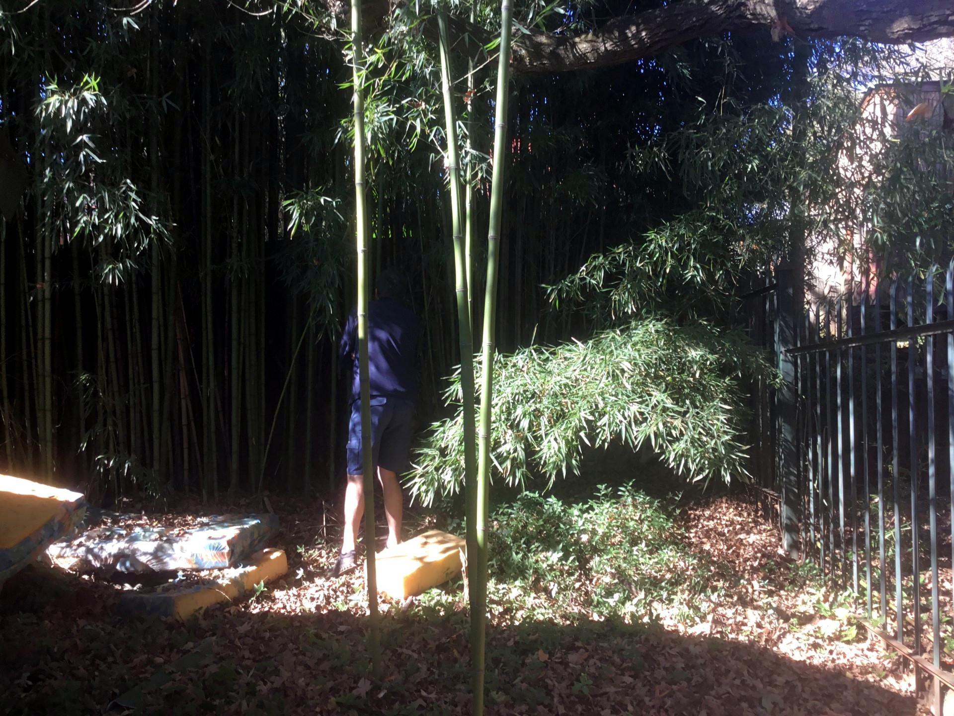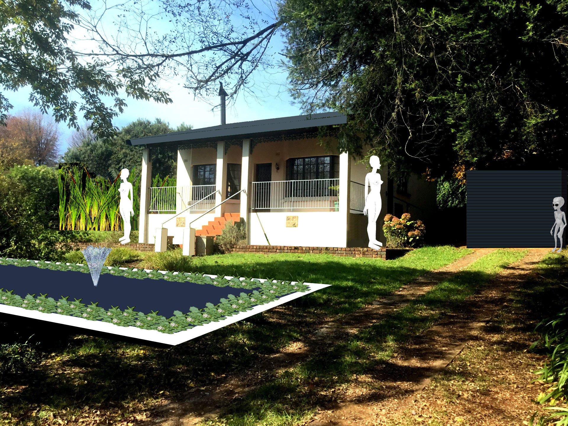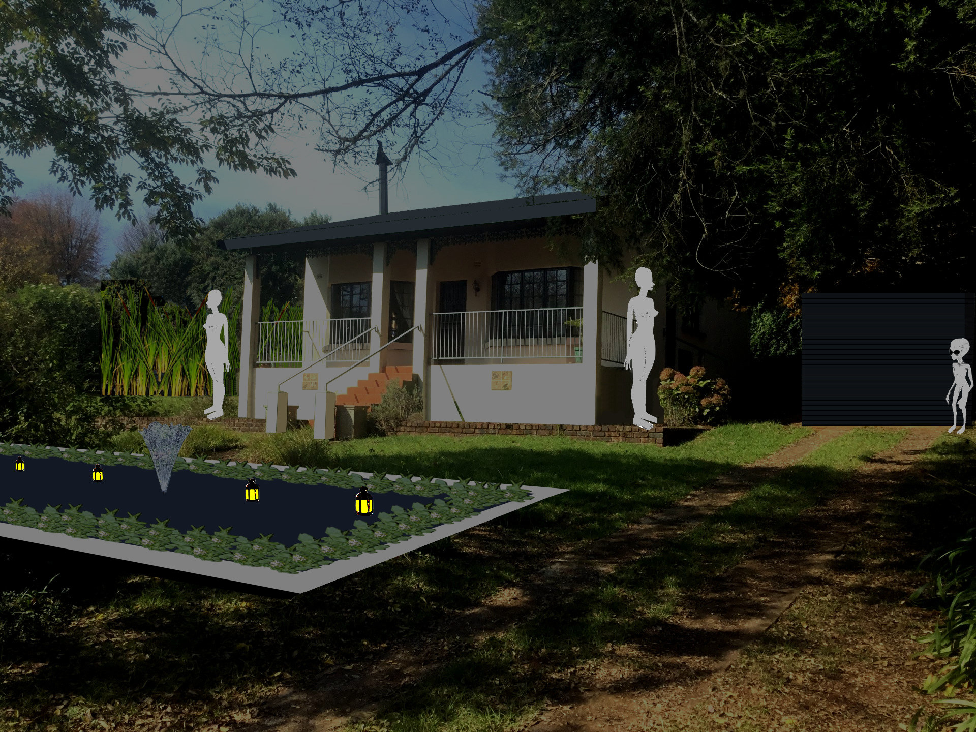 Front pond showing the Watercress on a surrounding shelf, a duck / fowl house (dark grey structure on the right) and sculpture of ET Aliens (lady Anunnaki and a short Grey).