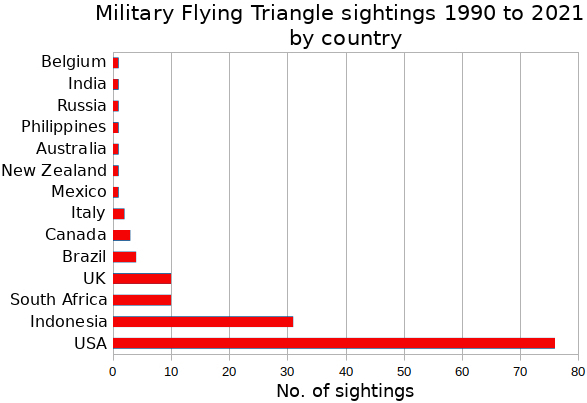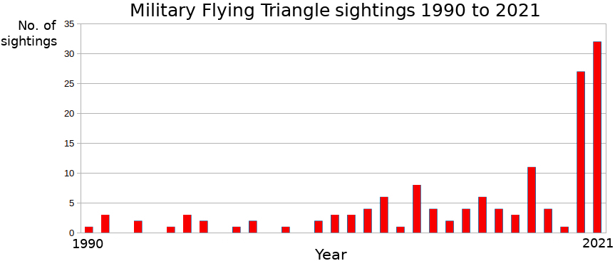 The following graph shows the number of military Flying Triangle sightings per year from March 1990 until the end of 2021. Note: The list of Flying Triangle sightings is not exhaustive. These are the cases that I happened to find when searching online for cases to include in the broader study. However, I believe that these findings (particularly the surge in Flying Triangle sightings in recent years) would be consistent with the findings of a more thorough study.