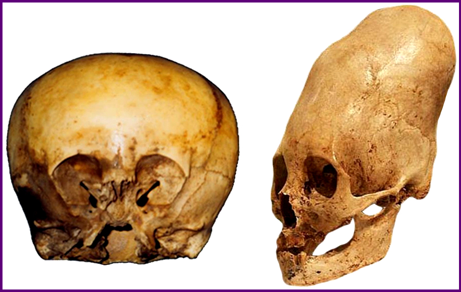 • Structurally different to normal human skulls — (i) only one parietal plate (normal human skulls have two), (ii) the foramen magnum (hole in skull through which spinal cord passes) is back towards the rear of the skull (in a normal skull it is closer to the jaw line) and also smaller than normal, (iii) some of the Paracas skulls have a very pronounced zygomatic arch (cheek bone), different eye sockets, and no sagittal suture (connective tissue joint between the two parietal bones of the skull).