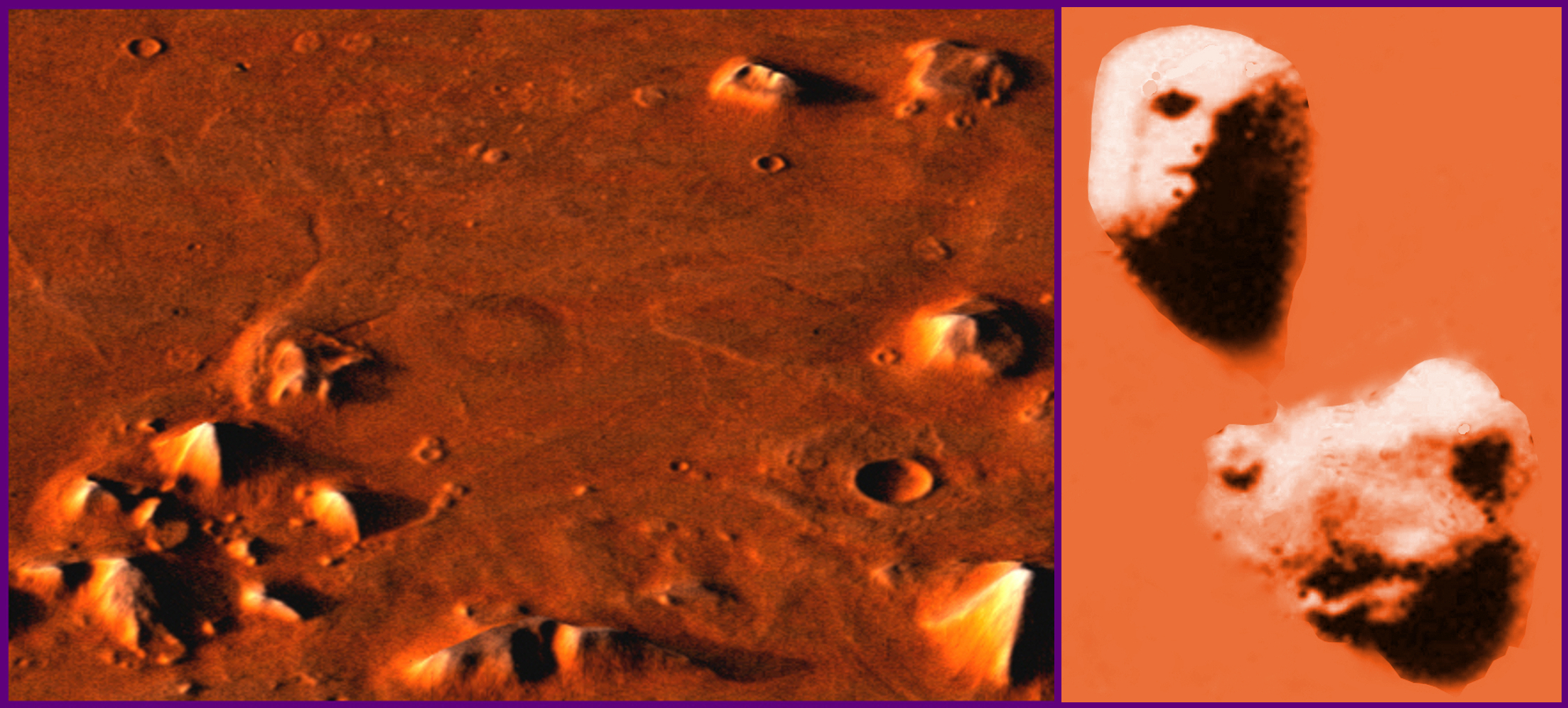 Figures 2a and b. Pyramids and sculpture, including a face (top R in Fig. 2a) in the Cydonia region of Mars. The face is almost certainly of Anu.