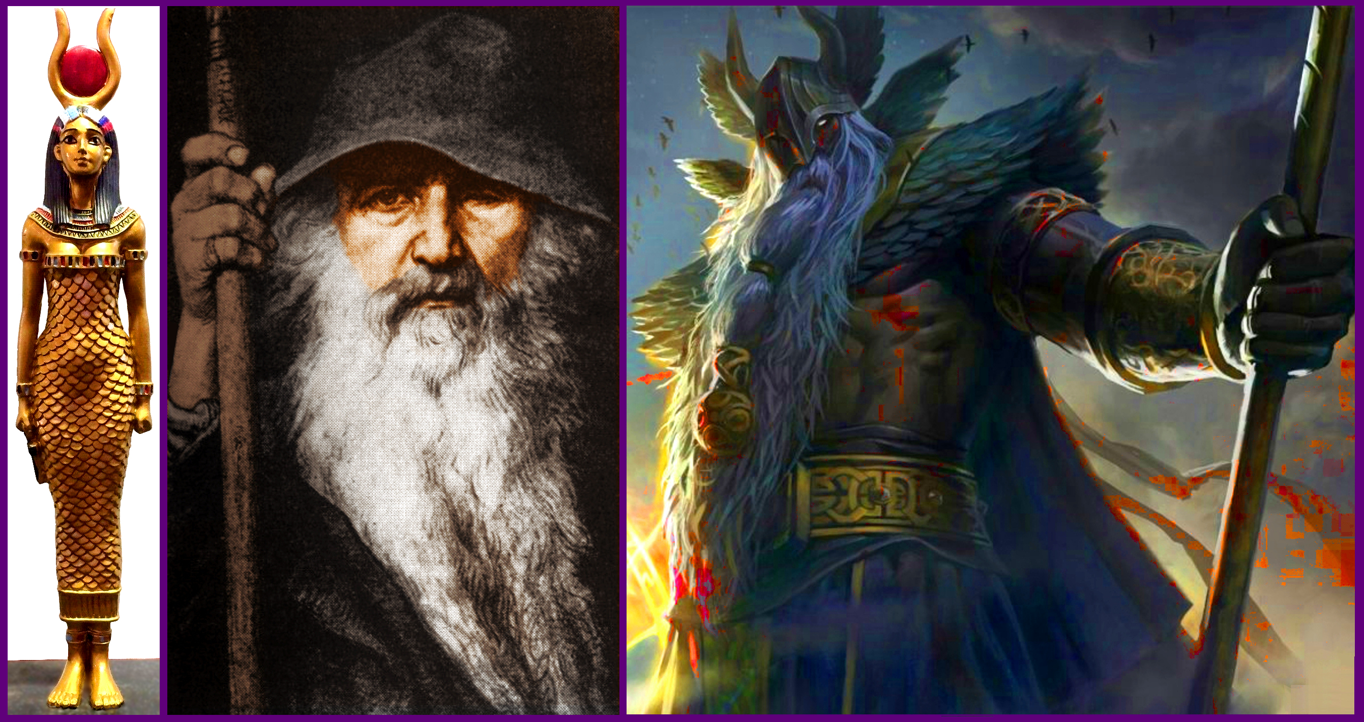 Figure 6..Aspects of Mind: Our gods / goddesses of natural religion. For example, goddess Isis showing her amphibious (mermaid) qualities (fish scale dress that binds her legs together) and Odin (Wotan), the central god in Odinism (paganism in the Northern European tradition). Odin is shown in his guise as a wanderer and as the god of rage and battle.
