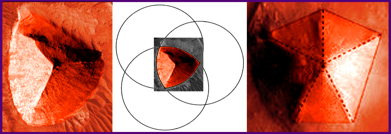 Figure 4. The Code: A Reuleaux pyramid (L, C) in the Candor Chasma region and the D&M pyramid in the Cydonia region on Mars.