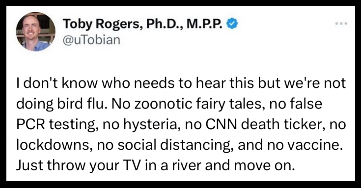 “Bird flu” (with all its HN numbers, ‘variants’, computer graphics, crisis actors, etc) is more jew bullshit.
