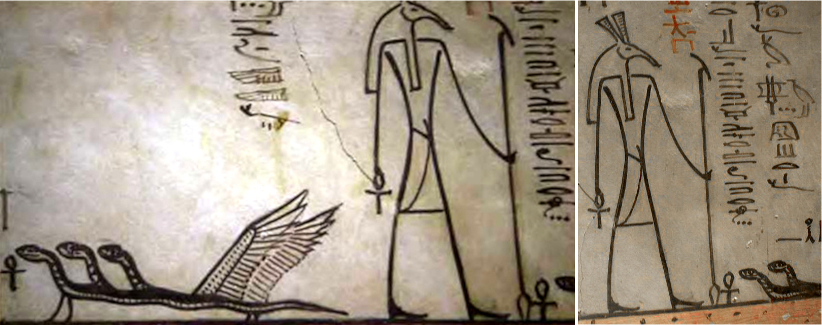 Notable features in this image include (a) the representation of Set (identifiable by his head), (b) the Ankh in Set’s right hand (also near his left foot and elsewhere), (c) the ‘Was’ symbol (the staff in Set’s left hand), (d) serpents (snakes approaching Set on the ground, and three winged snakes taking flight to his rear), and (e) a pair of wings (above the snakes’ wings).