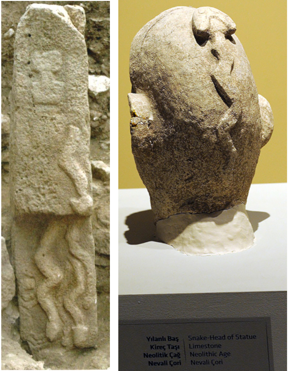 Carvings of snakes at Gobekli Tepe (L) and Nevali Cori (R)
