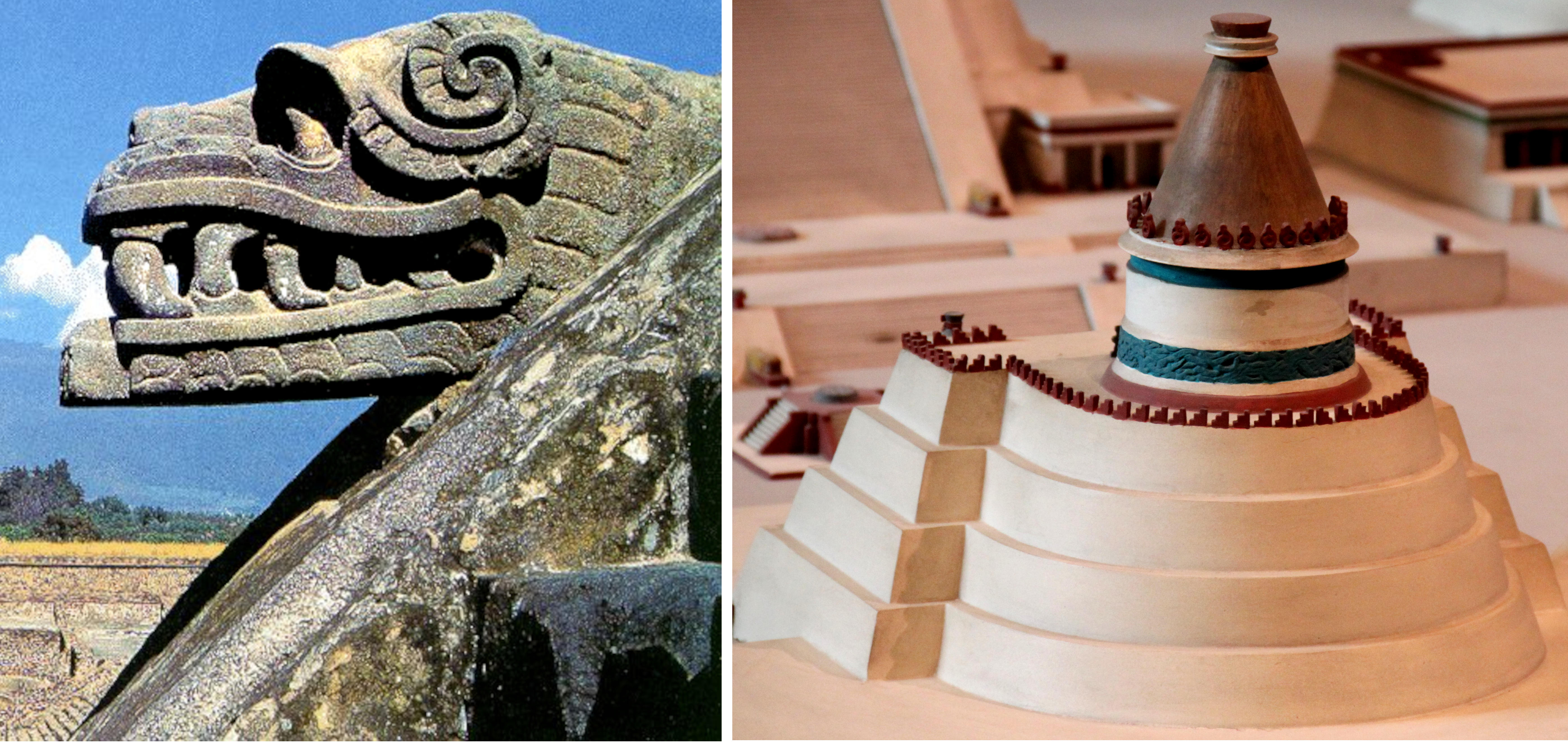 L Temple of the Feathered Serpent in Teotihuacan, R Model of Quetzalcoatl’s temple in Tenochtitlan