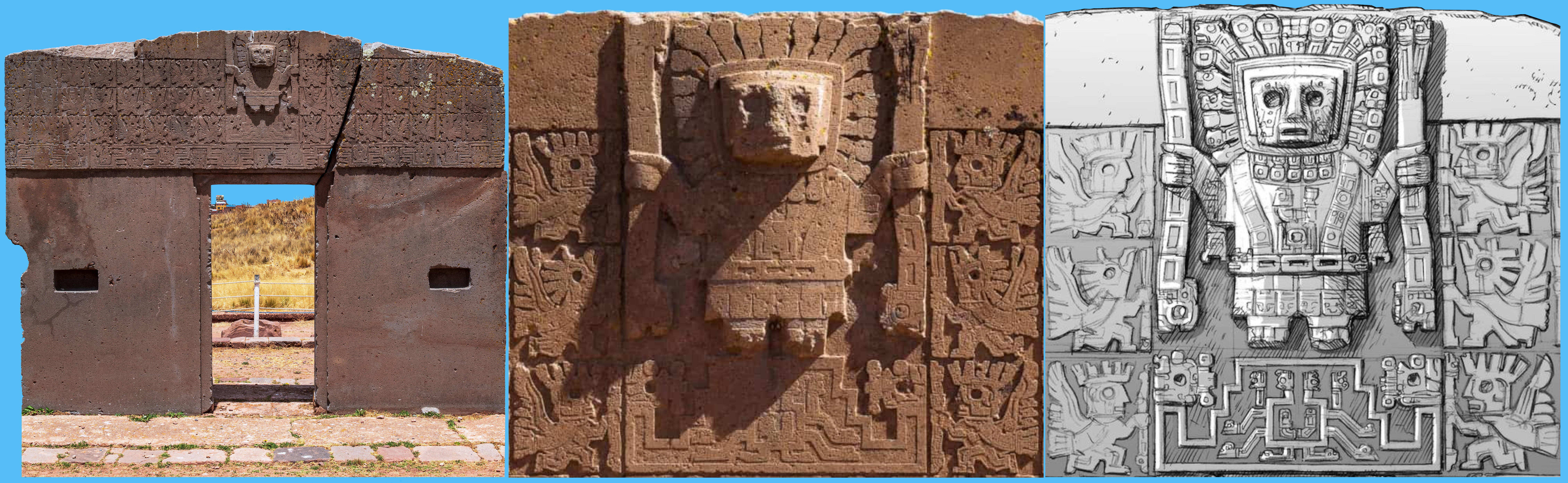 The Gate of the Sun is a monolithic gateway at the site of Tiwanaku in Bolivia where an Andean civilization of Bolivia thrived around Lake Titicaca from about 500-950 CE.18 However, the Gate of the Sun has been dated to 300 or 200 BCE or possibly about 110 CE.19,20,21,22 The above images show a full front view of the gate, a section of the gate with the god and some surrounding features, and an artist’s illustration that shows details of that section more clearly.